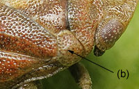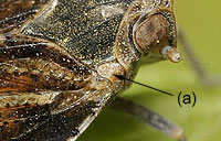 8. Distinct keels above the bases of the antennae (a), ocelli on vertex (just behind the front margin)
